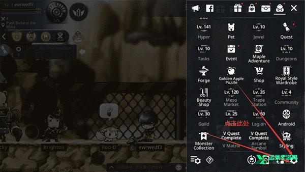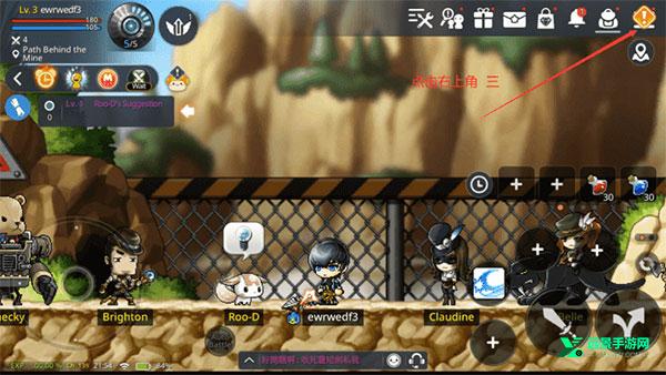 1、打开冒险岛世界亚服,进入游戏后点击右上角“三 ”(感叹号覆盖的地方)