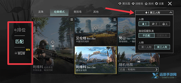 3、然后根据自己的喜好选择地图,点击右上角还可以选择单排、双排和四排