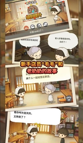 游戏主线:通过制作料理卖给客人赚钱,不断的研发新料理,购买新设备,以及触发老奶奶与客人、老爷爷之间故事。