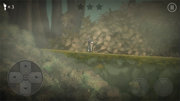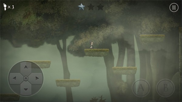 3.继续利用方向键操作角色,在森林场景中跳跃过石质平台,沿着路径探索,推进关卡进程