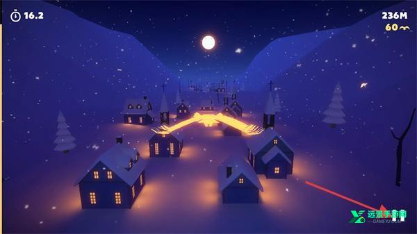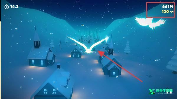1、操控飞鸟在雪地村庄场景飞行,留意右上角数值,探索环境。