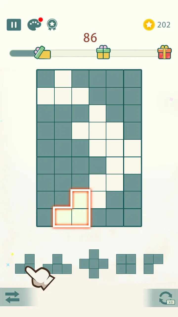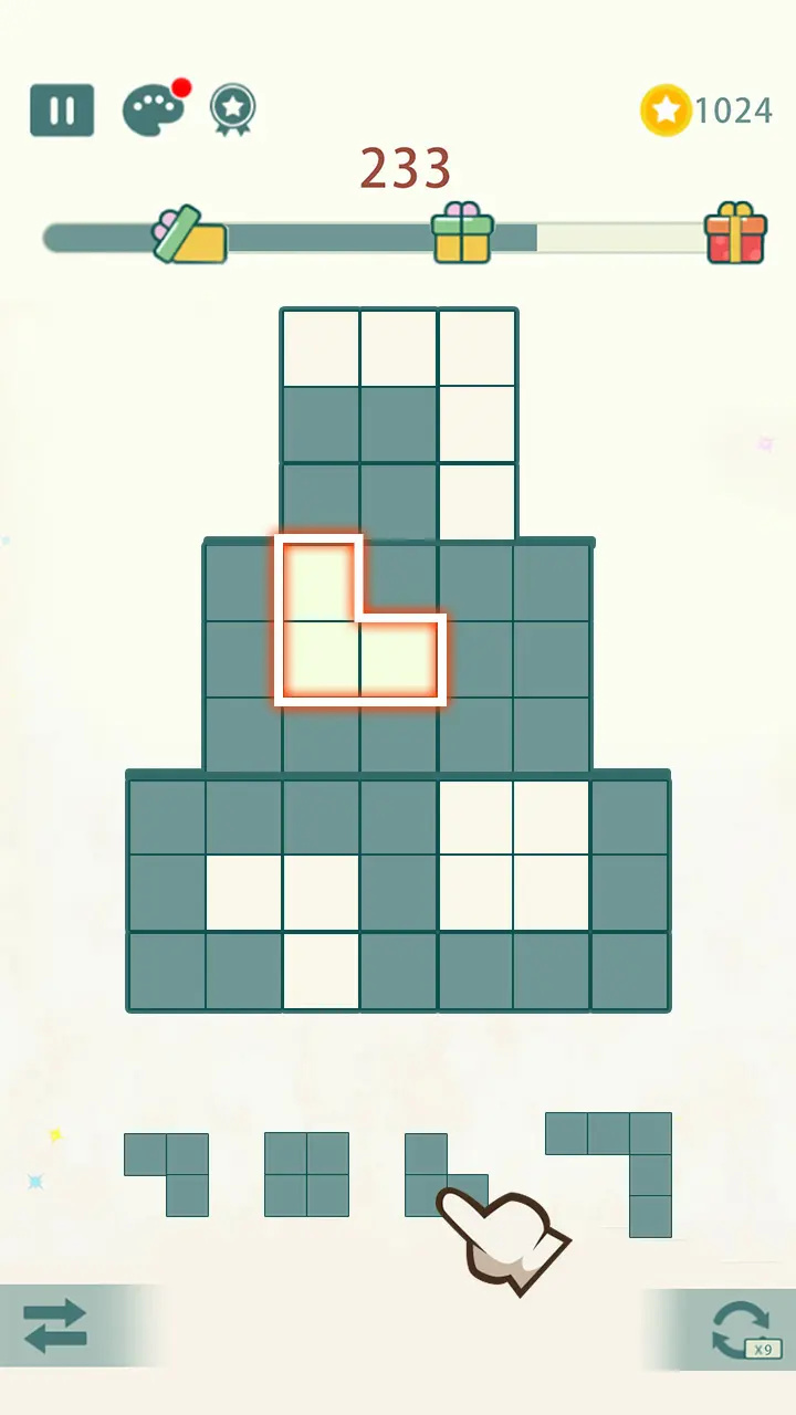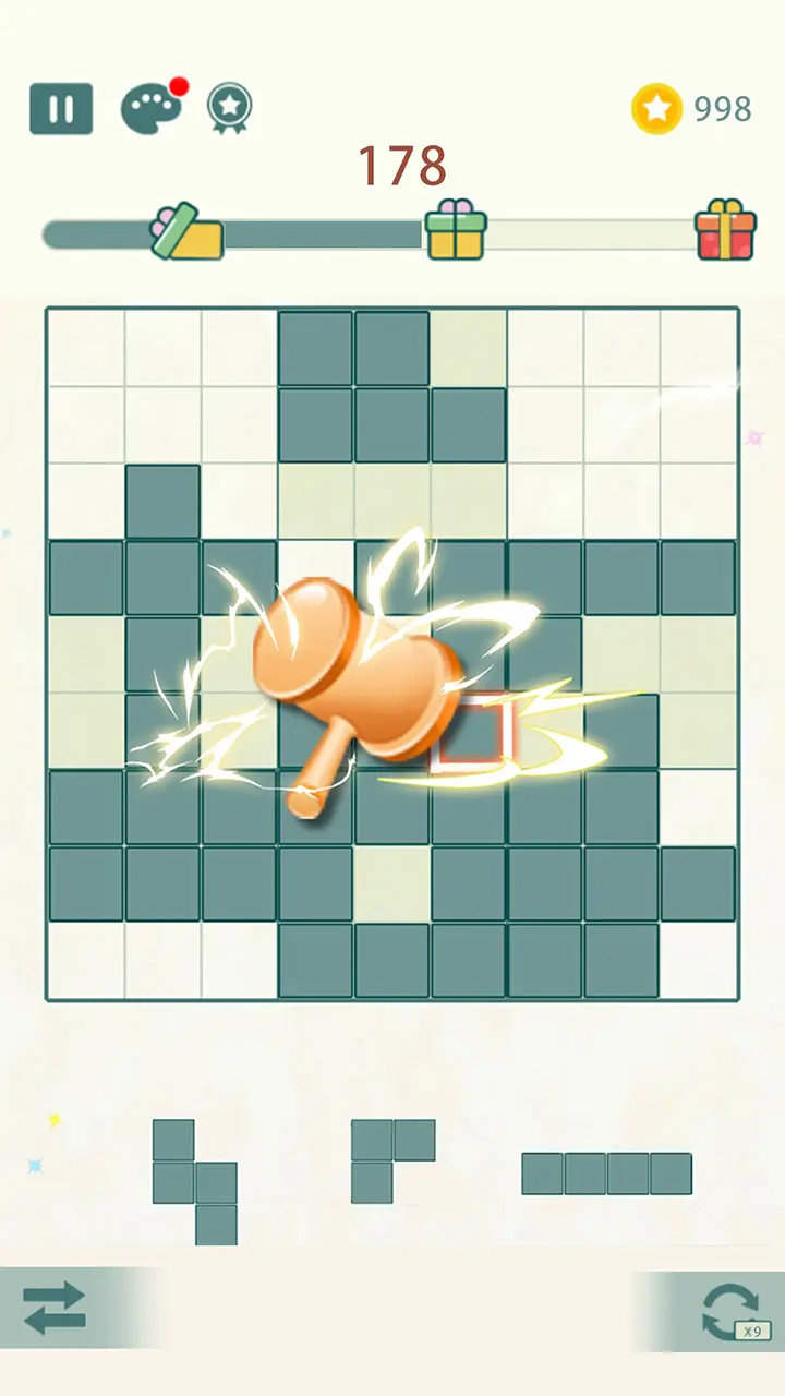 2、使各个不同形状的方块能够填满棋盘中的任意一个九宫格或者行列后消除得分。