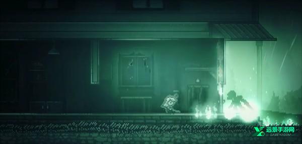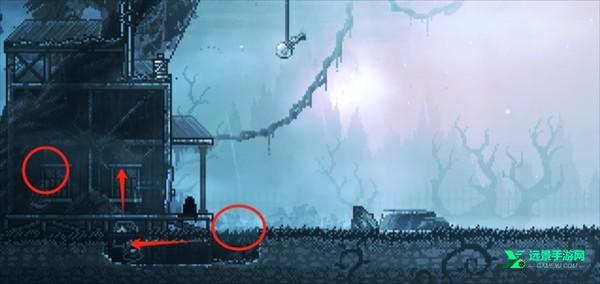 3.流浪者视角。往左走到房子前松动的木板上,站在木板上跳几次,破坏木板,从木板下的坑道爬进房子,获得镰刀。然后推开房门出去,砸死门外的黑色怪物。