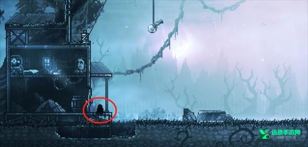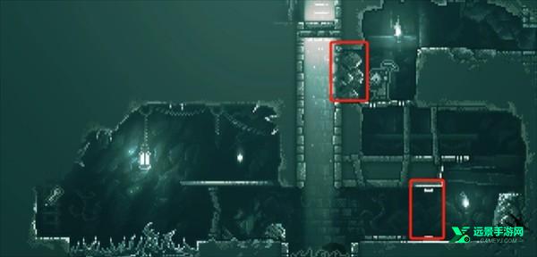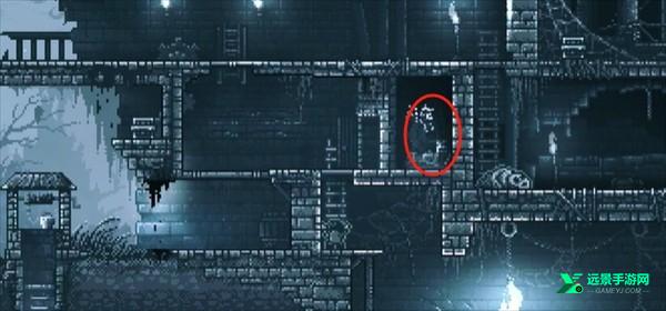 15.遭遇怪物后,迅速返回下图的地方,等怪物跳过右边后,迅速爬左边的梯子,往左跑,跑到左边的尽头后往上爬,爬到最高层后往右跑,直到怪物掉进尖刺坑里。