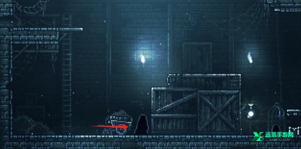 5.把推车推到梯子和黑色怪物中间的地方,然后爬上梯子,跳起来勾引黑色怪物。黑色怪物跳下来后,把推车推过去压死怪物。之后继续往右,进入关着黑色怪物的笼子左边。