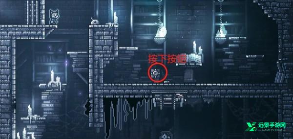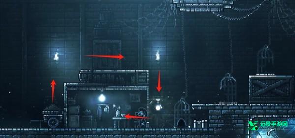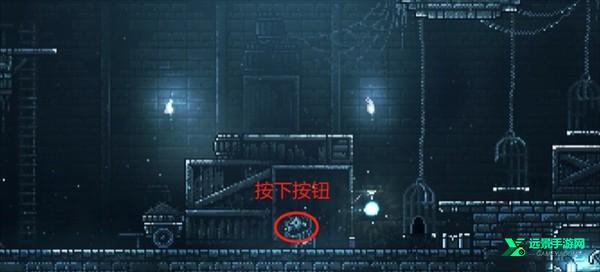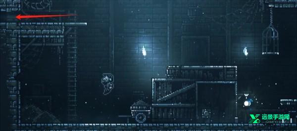 7.流浪者视角。按下黑色怪物左边的按钮,3个铁笼升上去,爬上铁笼往右走,然后爬最右边的梯子上去。