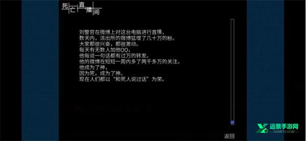 死亡直播间是一款沉重独特的纯文字视觉游戏,在这款游戏中有着简洁的游戏画风和独特的剧情展开,玩家将化身为一个名为陈默的主播,需要运用自己的策略和超能力拯救一个又一个濒临死亡的角色。