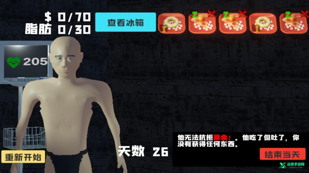 3、当出现3个暴食的食物,角色就会吃到吐,会导致失败,需要重新开始这一天
