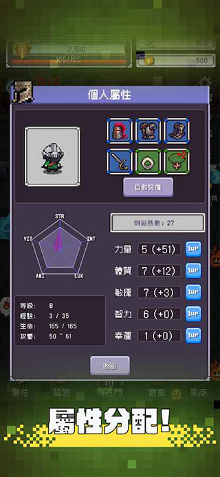 1.进入游戏后,先点击左下角的【属性】按钮,继承前任勇者遗留的各项属性