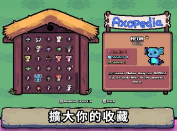 ak蝾螈突袭手机版作为一款根据Steam同名游戏的移植版本,英文名叫做AK Xolotl。在游戏中我们将化身成为一只粉色蝾螈,需要在随机生成的地牢房间中不断穿梭。而每踏入一个不同标志的房间,为我们带来的都是全新的挑战!如果咱们运气好的话,甚至还能进入奖励房中,什么都不干就能领取一大堆奖励。而且游戏中的武器种类极其丰富,有些传说级神器还能做到一击清屏,那种感觉想想就很爽快!