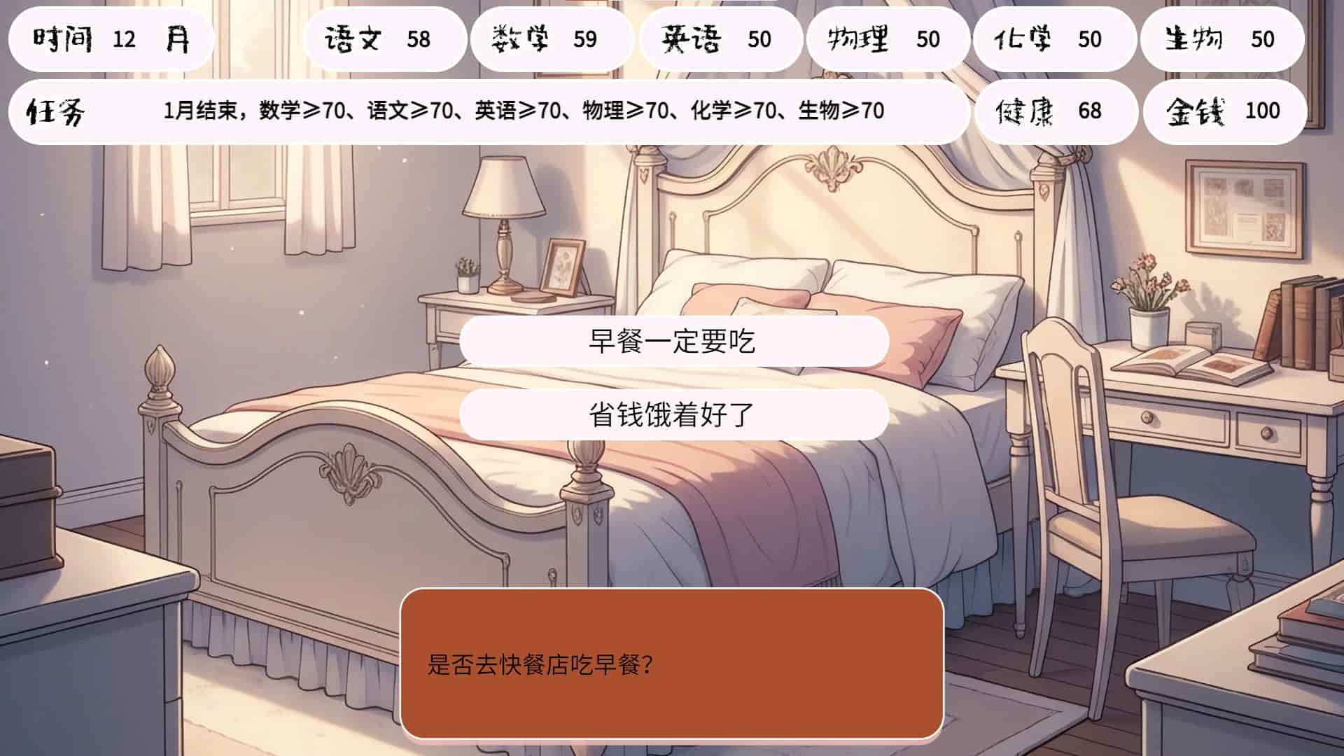 2.游戏设有“人生抉择”系统,每个关键节点提供多个选项,例如是否接受补习班、如何应对家长的不合理要求,不同选择将影响角色属性与剧情走向