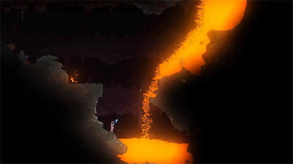 游戏中的每个像素都有物理属性,一切都可以燃烧、爆炸或融化。比如液体会顺坡流下,水中会有阻力,不同的液体会分层;油和木制品会燃烧,火花飞溅,引燃其他物品;岩浆的高温会侵蚀物体,遇水凝固成石头。这种高度物理模拟给游戏带来了丰富的可能性和不可预测性。