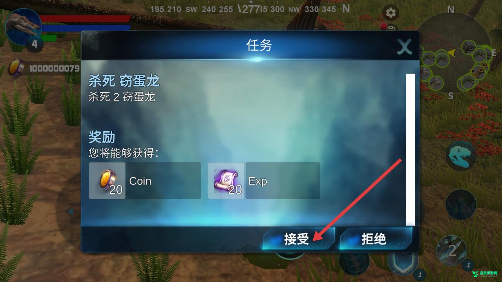1、看到【杀死-2-窃蛋龙】的任务,奖励是【20-Coin】和【20-Exp】,点击【接受】接取任务,开启狩猎。