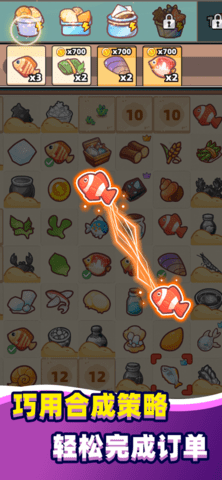 深海寿司游戏是一款以寿司制作为核心玩法的模拟经营游戏,游戏中玩家将成为一名寿司师傅,在餐厅内根据顾客订单,通过点击、拖动等操作完成选材、加工等步骤,完成订单。制作寿司完成订单之外,深海寿司游戏还有出海进货的环节。这个环节的主要玩法类似于连连看,玩家只需要选择两个一样的素材就可以进行消除,完成进货的目的,让店里的食材更充裕。