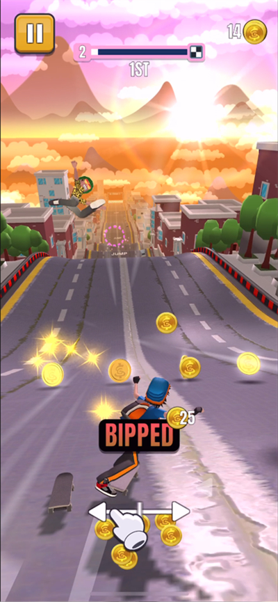 菲利滑板2是一款竖屏的休闲卡通风格的3D手指滑板游戏,游戏中拥有丰富的关卡挑战等待玩家体验,每一关你都可以在不同的赛道场景中进行滑板跑酷,在关卡的赛道上拥有非常多的金币,你需要操控滑板进行左右滑行来收集这些金币,在到达终点前尽可能多的收集金币,这些金币可以用于在游戏商城中购买解锁新的滑板,当然在菲利滑板2手游中,你还需要与其他滑板选手们进行比赛,夺得比赛冠军吧!