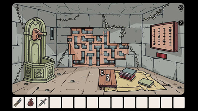 7、输入符号打开书柜拿到「扳手」和「棋子」,再观察留言板上的卡片(注意每个棋子对应的位置),接着将棋盘棋子放置正确的位置(如上图)获得「电池」