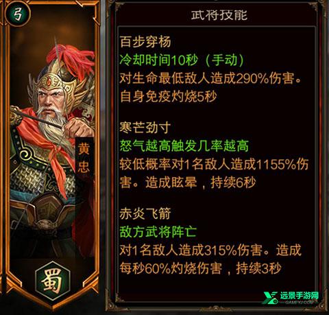 第一个武将是黄忠,因为黄忠是弓将中技能冷却时间段只有10秒,技能可以造成伤害290%还可以自身免疫5秒的灼烧伤害,黄中的第二个技能还可以造成眩晕6秒,黄忠还是推图白送的武将可所谓经济优势会。