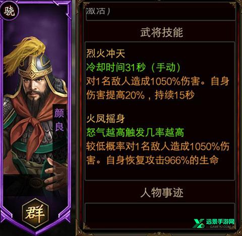 第二个武将小编推举颜良,别小看在剧情任务中送给大家颜良,颜良虽说是紫色武将可是伤害是相当的高啊,技能可以对敌人伤害1050%自身还可以提高伤害20%这是多么好的伤害,还可以恢复攻击的966%生命,所以小编为大家推举颜良经济实惠很适合大家试用。