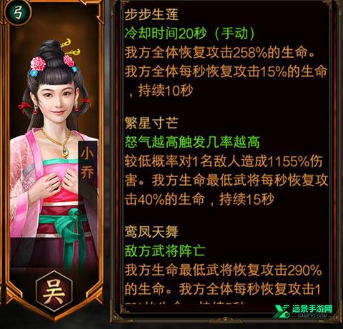 第三个武将是小乔(个人喜欢小乔大家也可以换成刘备或者荀彧还有华佗都是可以的各有各的好处可是小编是喜欢小乔的在这里就不多说了,你们懂得美女吗。)小乔技能给我放全体恢复攻击258%生命还让我方全体在10秒里恢复攻击的15%生命,小乔还可以造成伤害1155%所以小编喜欢小乔大家也可以试用下。