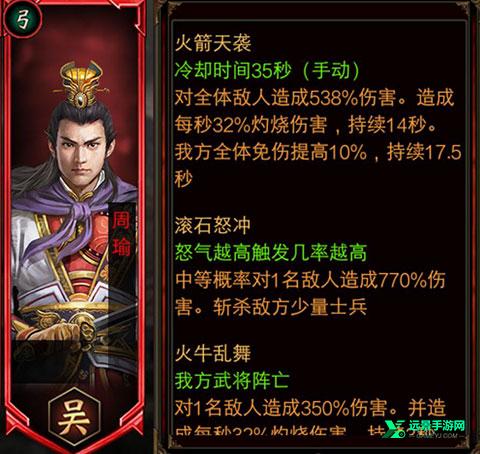 最后一个是周瑜,周瑜是一个群伤害最高的可以对敌方全体伤害538%还有每秒32%灼烧伤害持续14秒,还可以提高全有军提高10%免伤持续17.5秒就这样的群伤不用周瑜还可以用谁,再说还和小乔有缘分武将附加的伤害。
